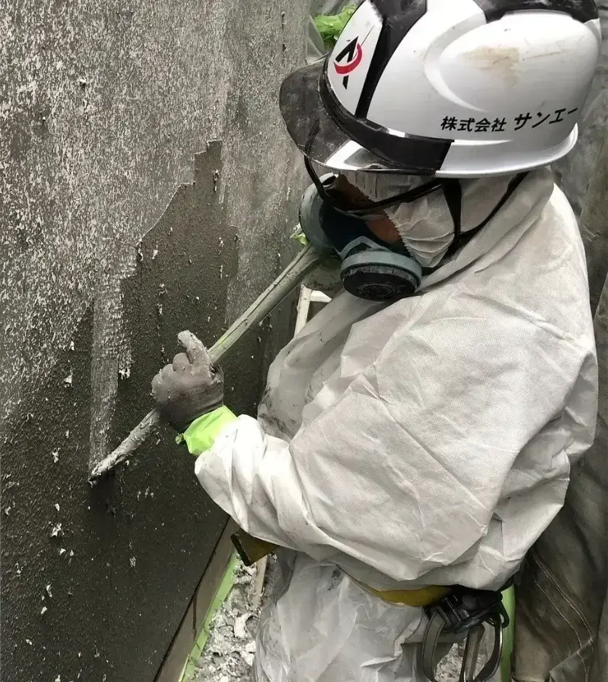 超高圧の水流を使用し、アスベストを含む塗り材を洗い流します。